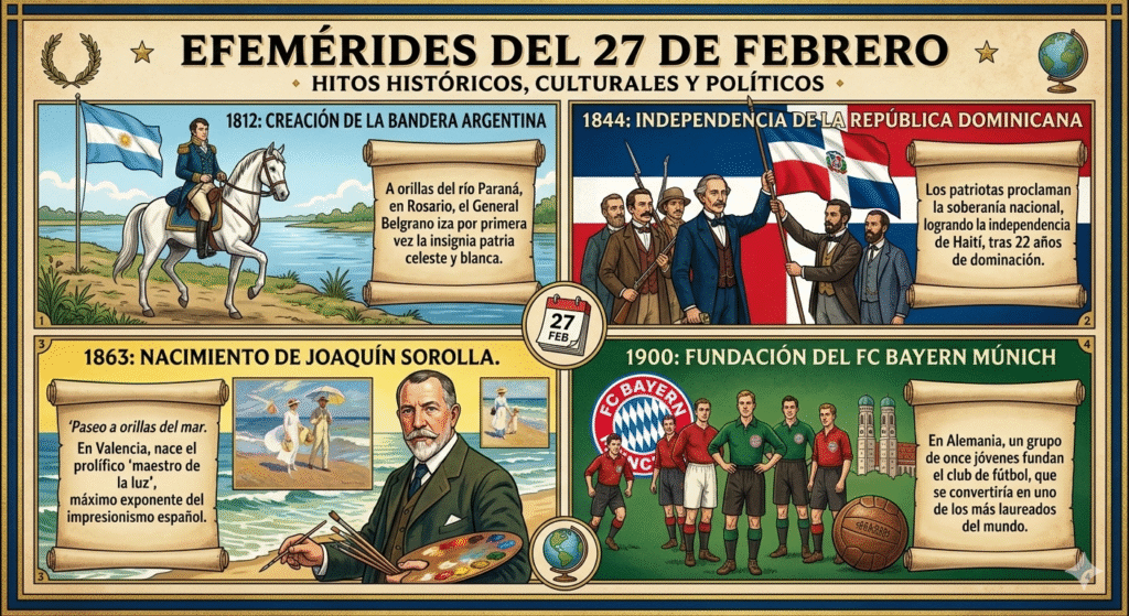 1812 en la aldea de Rosario (Argentina), el general y abogado Manuel Belgrano, iza por primera vez la bandera de la Argentina, dando origen a la República de la Argentina.